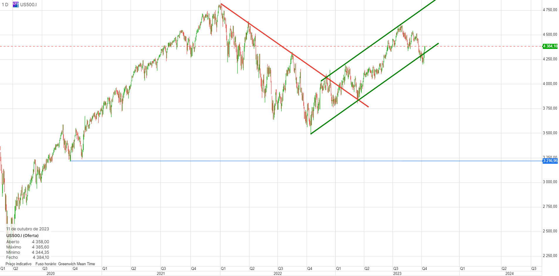 Quebra do suporte e ida ao objetivo. Agora haverá uma reação, mas chegados a 4350 os ursos podrão de novo mostrar as suas garras. Esta quebra é para mim um sinal baixista.