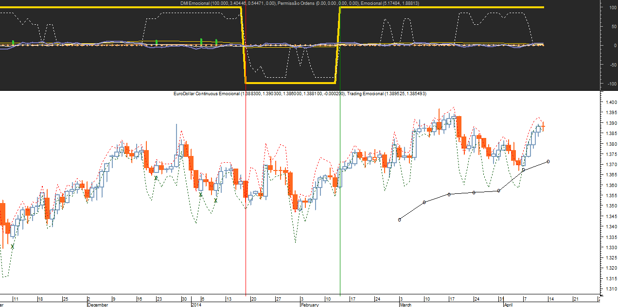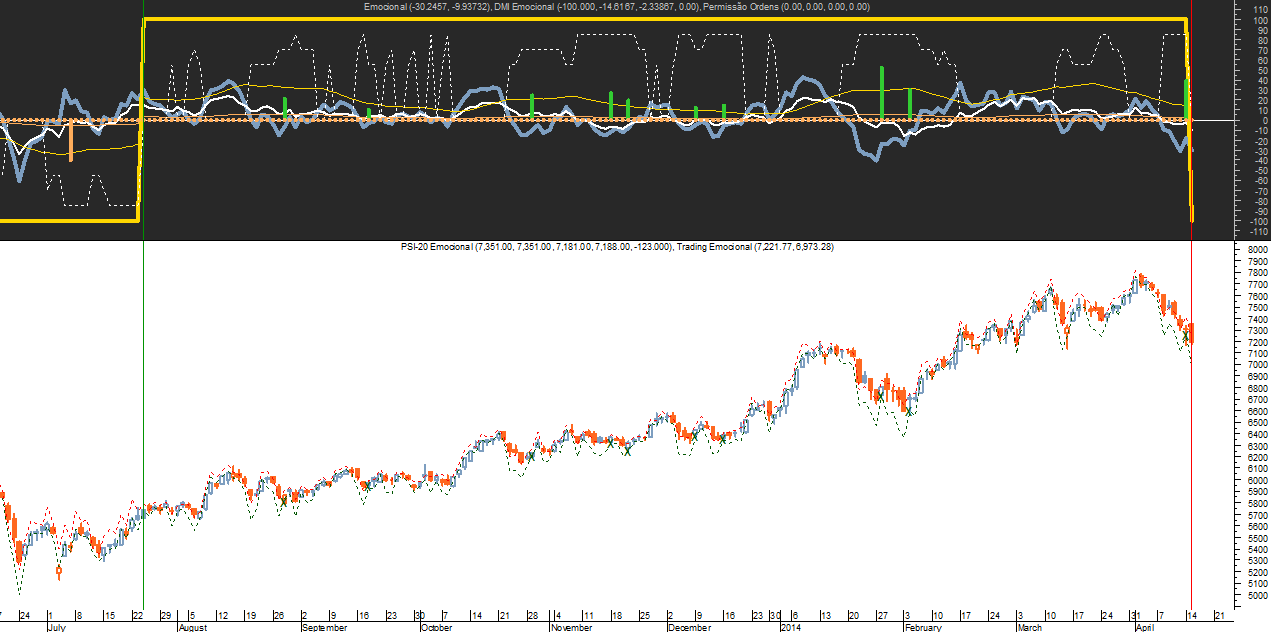 Para além do mais a versão de 2014 contém um novo dado um pouco mais avançado que procura prever com mais um dia de antecedência o comportamento provável do mercado na sessão seguinte, com isso consegue-se na componente oscilatória antecipar muitas vezes as bases e topos dos swings que podem ser aproveitados para trading do tipo cíclico e esse dia de antecipação pode valer uns trocos importantes.