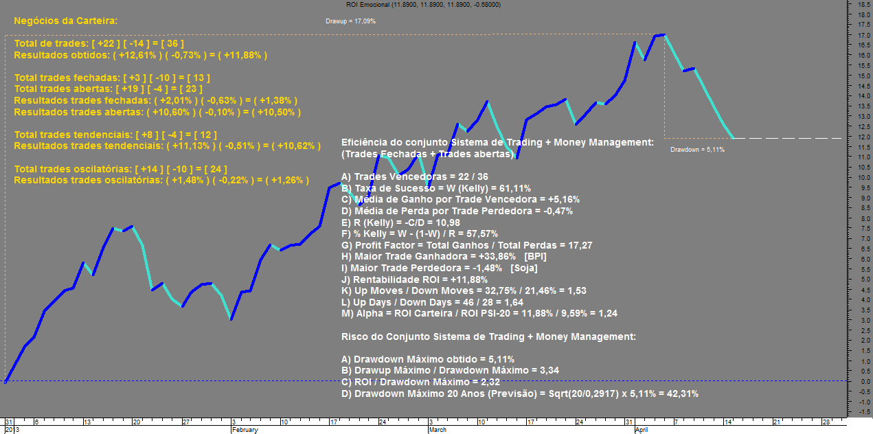Conforme podem ver também no quadro do gráfico relativo aos fatores de eficiência do sistema de trading, indicados em branco, resolvi introduzir a partir de agora o acompanhamento do fator “alpha” que mede simplesmente a relação entre o retorno da carteira e a rentabilidade do índice maioritário de referência que serviu de base à carteira, neste caso o PSI-20. O objetivo será a longo prazo tentar manter este “alpha” acima do valor da unidade. Será difícil, mas vamos tentar!