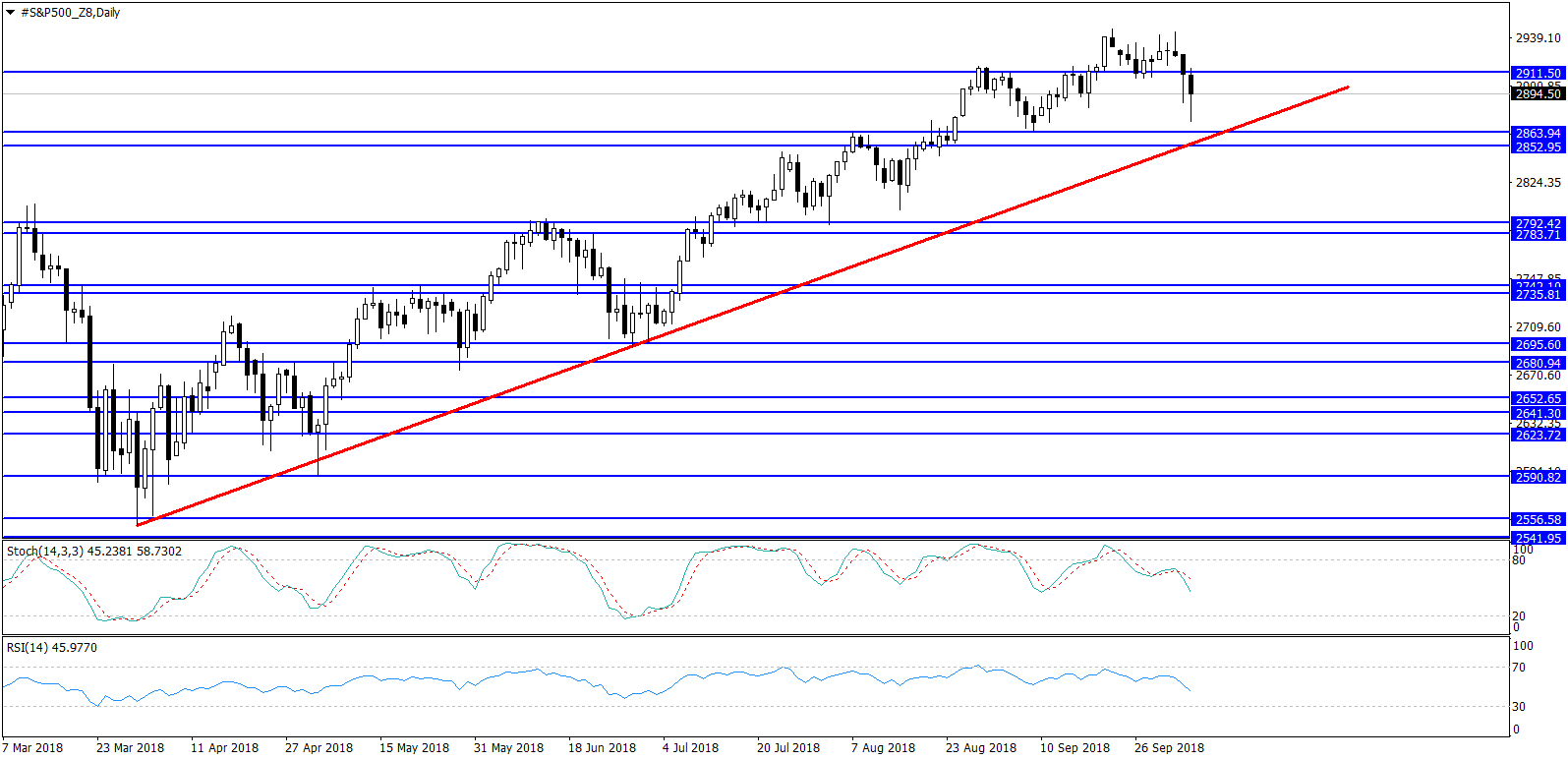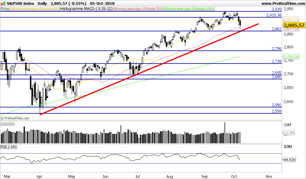 Hoje com as taxas USA novamente a subir os futuros USA estão a ficar bastante mais negativos e durante a sessão provavelmente o SP500 poderá testar novamente a MM50 nos 2878 e o suporte dos 2860