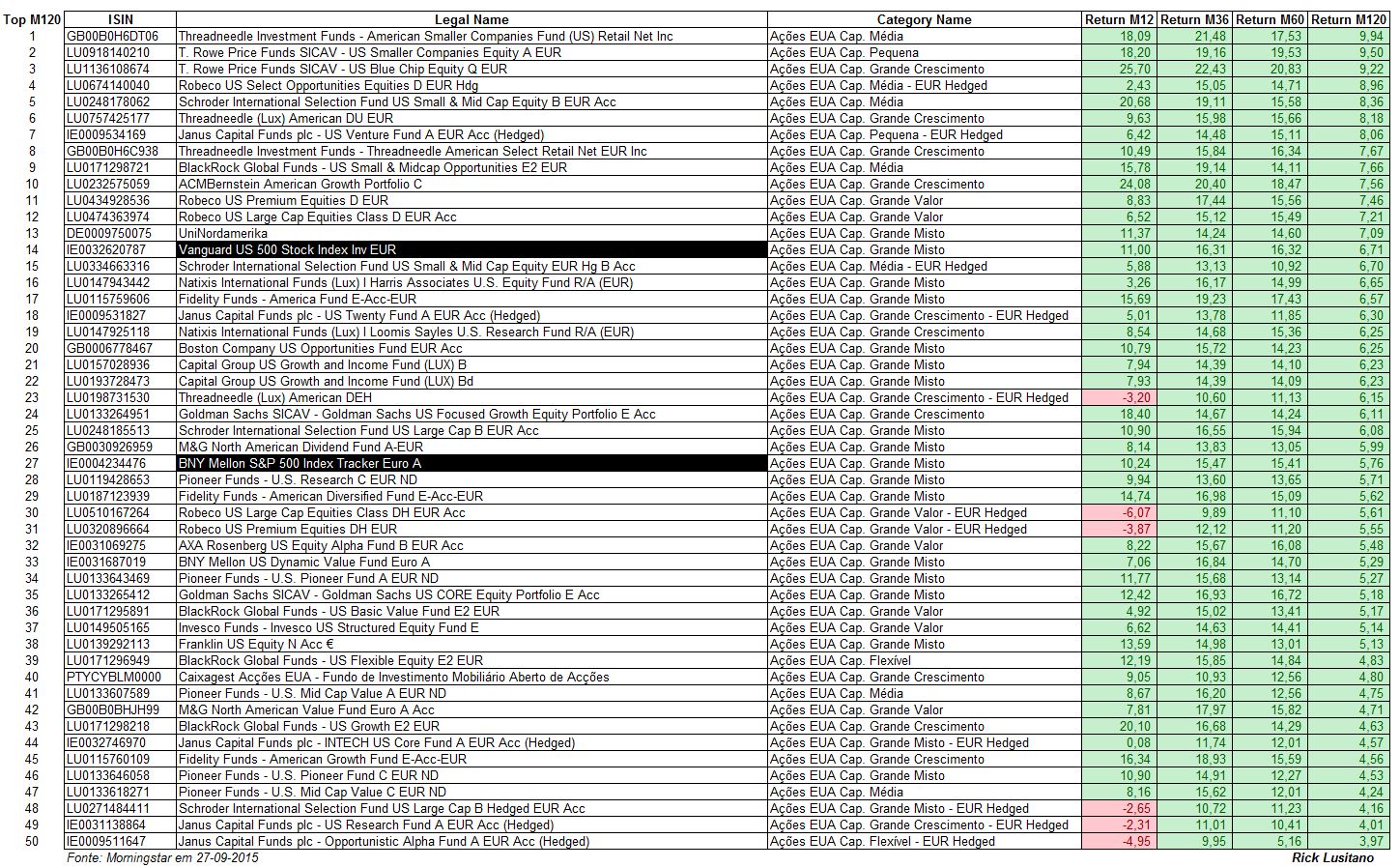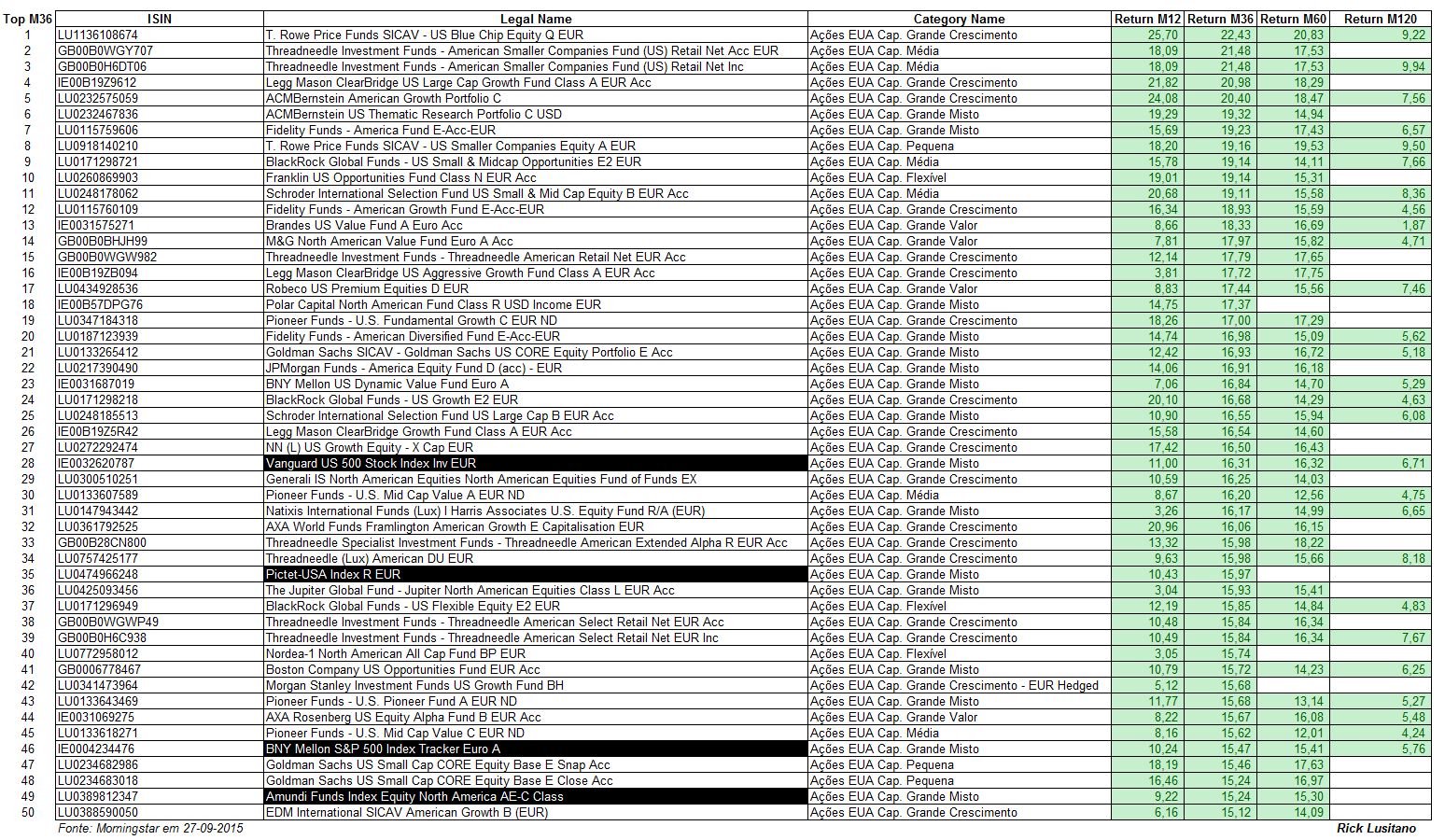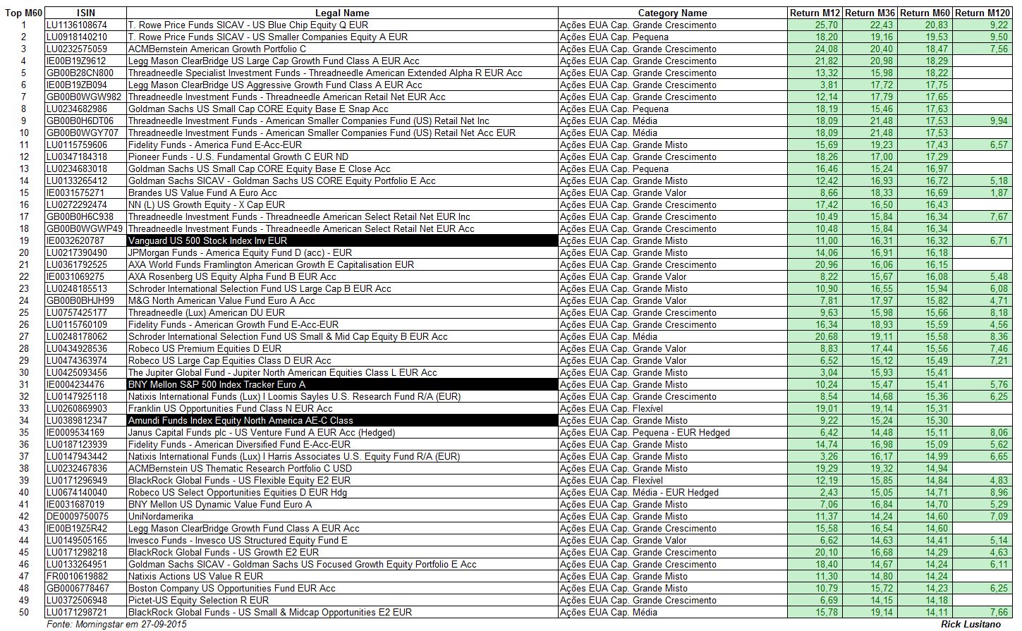 Deixo o Top 50 a 3 anos dos fundos de Acções EUA, denominados em EUR, inclui FI de gestão activa e fundos índices. Cada um pode tirar as próprias conclusões.