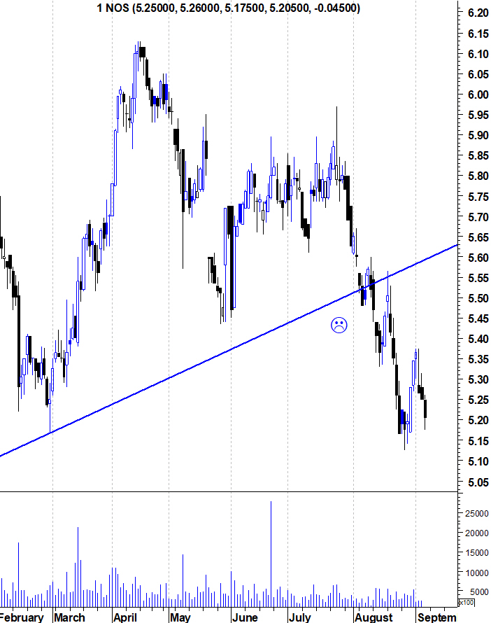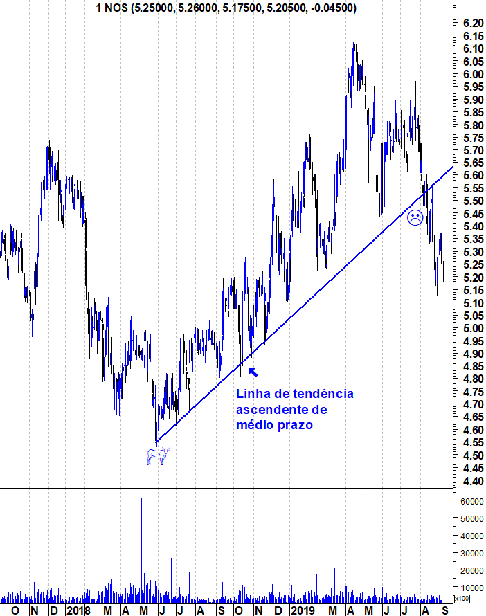 A quebra, em Agosto, da LT ascendente que vinha suportando as subidas da NOS no último ano, alterou, por completo o seu aspecto técnico. Ao longo deste período, sempre afirmei que me manteria optimista enquanto essa linha permanecesse intacta. Ela foi quebrada e, nessa altura, a razão para estar "Bullish" na Nos deixou de existir.