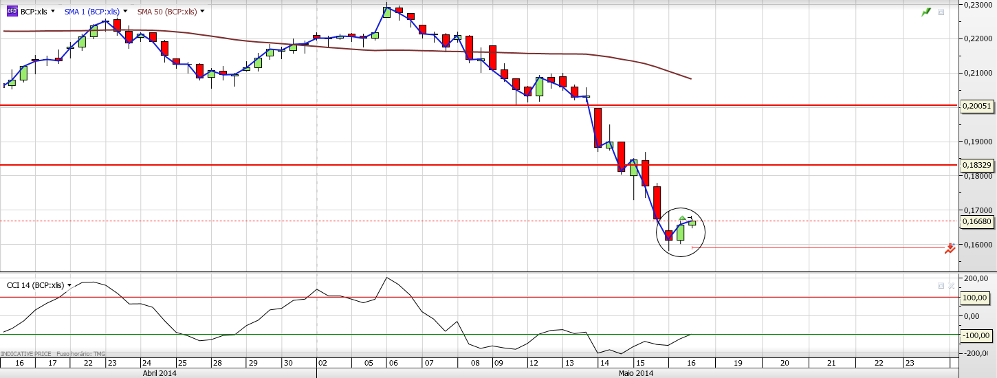 Hoje há uma nuance grande em relação aos dias anteriores: o suporte atingido. Os 0,16€ eram o grande suporte do título até ao momento e foram atingidos e validados logo de manhã. Neste momento, do ponto de vista técnico, há razões para acreditar que poderá haver uma inversão de curto prazo (aguardemos pelo fecho).