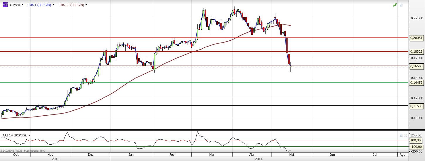 Pode haver aqui uma reação nesta zona de suporte onde está; ou então vai á linha verde que é a mm50 no gráfico Semanal
