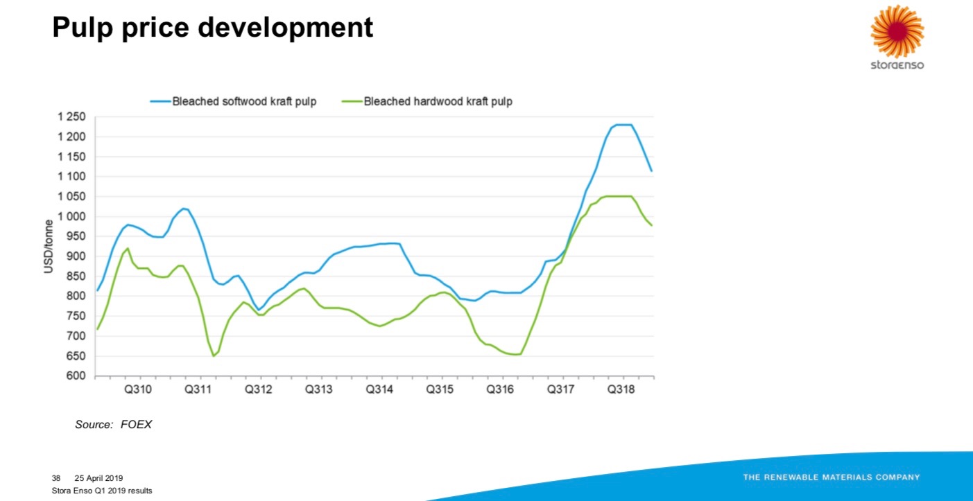 Apesar do setor estar a levar tareia, o que está a acontecer nas outras cotadas, também me parece que as correções estão a ser muito fortes. O Q1 não vai ser tão fraco como se está a prever. Como disse dólar está forte e apesar do BHKP ter diminuído no preço pago por tonelada a verdade é que na conversão para euros esbate-se o facto do valor ter diminuído. Nesse sentido diria que os resultados do Q1/19 comparativamente com Q1/18 oscilarão 5% para baixo ou para cima, isto é, entre os 30m e os 34m. Ve-se-á a 30/5 se os resultados são estes ou se diminuíram muito mais do que isto. Mais do que 5% para cima não acredito.