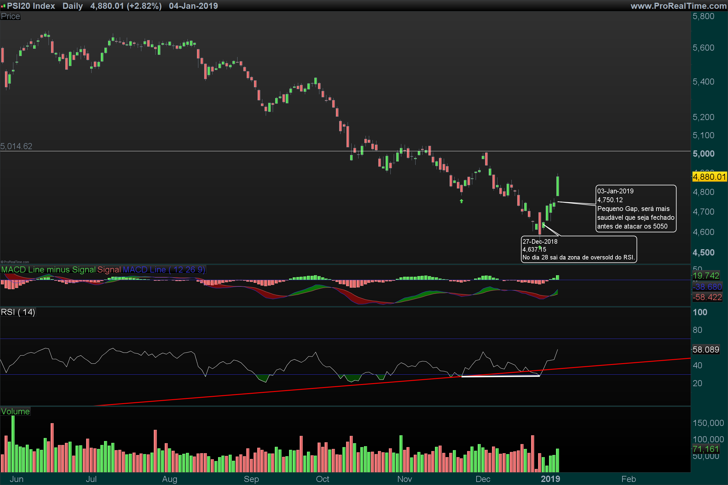 Esse post é de 19 de Dezembro estava o PSI nos 4744, podes postar aí o MACD e o RSI para ver se a divergência continua coerente com o mínimo de 27 de Dezembro?
