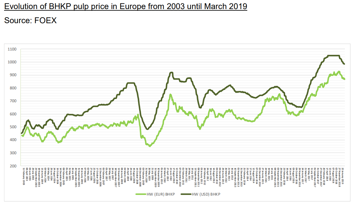 De facto no relatório de 2018 a Altri refere sempre o BHKP (geral) e não o BEKP (eucalipto apenas). Creio que esse gráfico é o mesmo que eles fornecem no relatório. Conheces algum site onde dê para acompanhar cotações diárias?