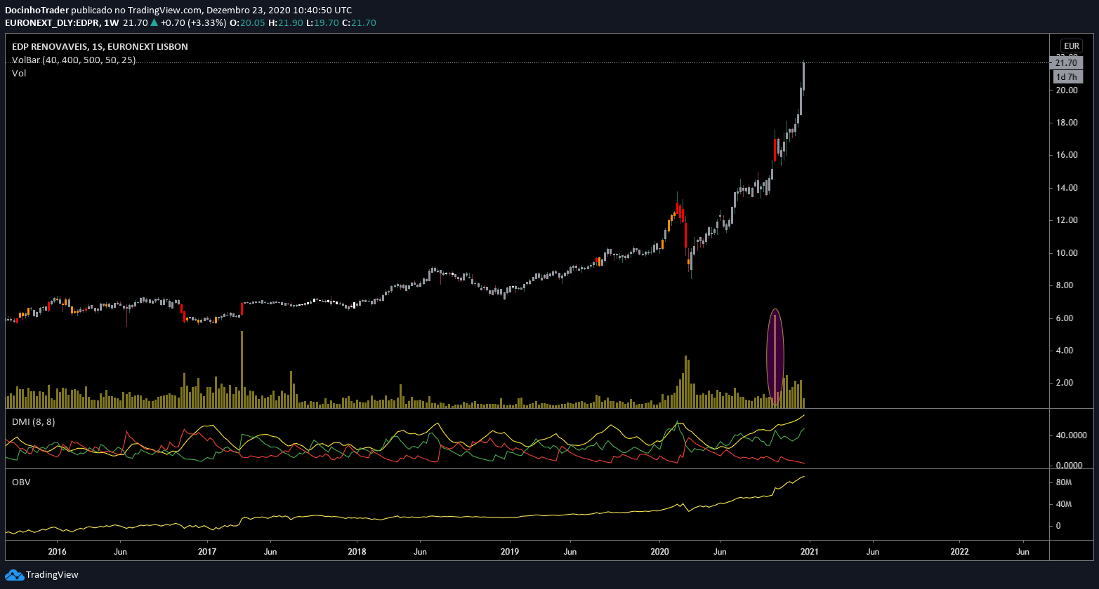 Indiscutível bull market da EDPR,indicadores comprados com saldo a acompanhar,apenas um senão,houve uma mexida de guita brutal nos 17 paus,veja-se o volume.Geralmente a malta compra em baixo e desova em cima.O que me pareçe ter acontecido aqui.Os indicadores diarios já revelam também exaustão.
