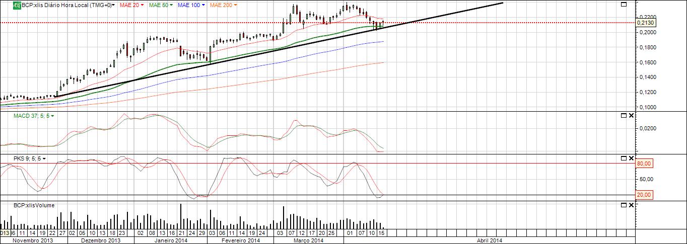 O BCP encontra-se num ponto chave para possível subida de curto prazo. Tecnicamente está suportado pela media móvel e ligeiramente sobrevendido.