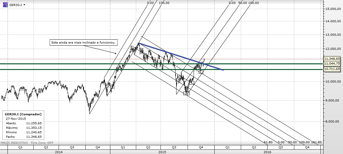 Até ver qualquer posição que assuma no dax será longa. Mudo de opinião se em vez de fazer um higher high fizer um lower low. Se fizer este lower low deve ser queimando a linha azul, as linhas verdes e o garfo ascendente.
