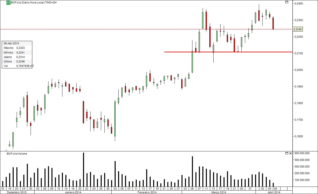 Online: MESA EUROPEIA; Notícias: BCP segue com suporte nos 0,2240-0,2190-0,2068-0,1966 e 0,1860 minimos de fevereiro de 2014. Resisteência nos 0,2280-0,2320-0,2390. A 2 horas o RSI abaixo dos 50 revela espaço ainda para cair aos 30, sobrevenda.