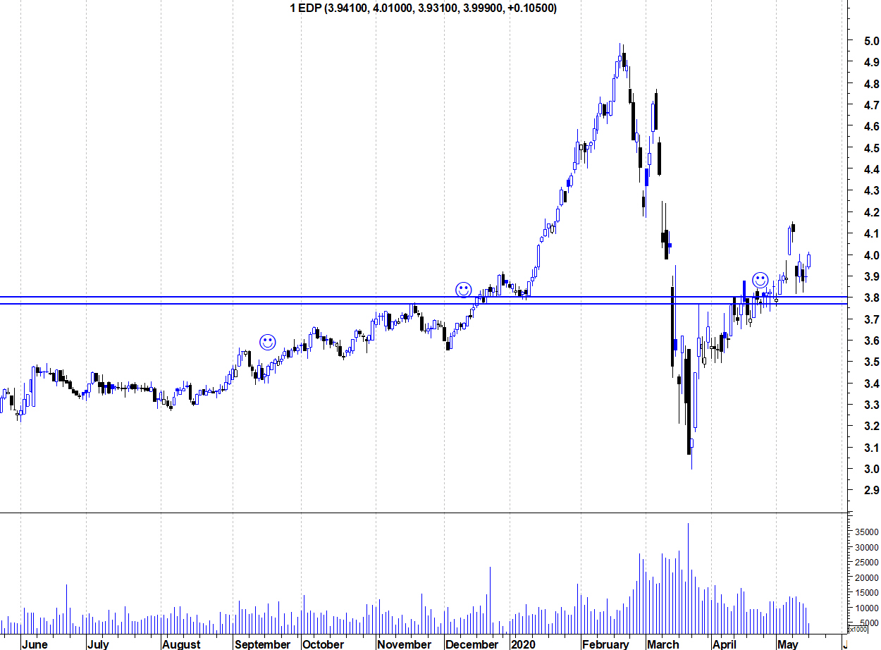 O desempenho da EDP tem sido notável. Voou no final do ano passado e no início deste ano e tem recuperado muito bem, depois do trambolhão do início da pandemia. Não nos podemos esquecer que já foi ali descontado o dividendo de 19 cêntimos, o que mostra bem o que a acção recuperou e a quebra da resistência dos 3,8 euros foi apenas mais um sinal disso.