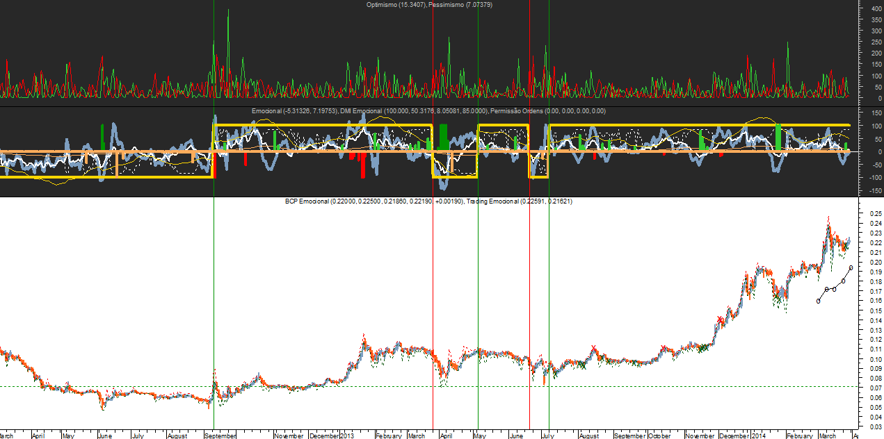 O fundamento que está por trás dos indicadores principais do sistema de trading, que designei por RECP (Rating Emocional de Curto Prazo) e REMP (Rating Emocional de Médio Prazo), pode ser visualizado abaixo no gráfico superior do BCP.