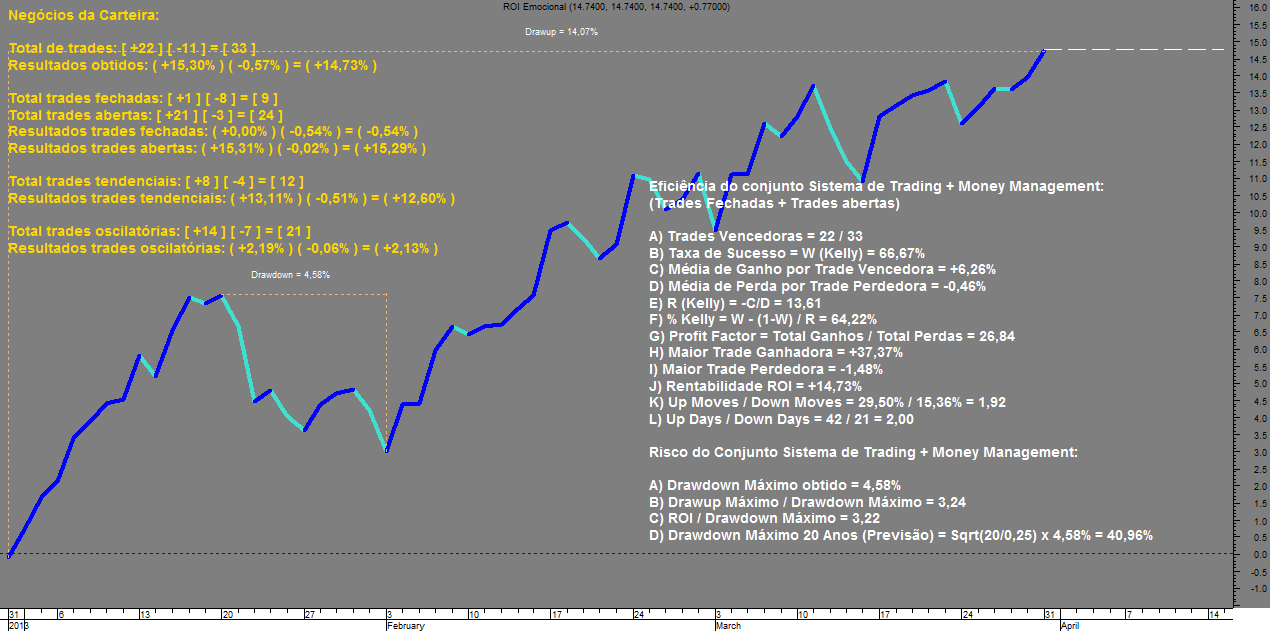 Por outro lado há que ter em conta que, enquanto os valores de eficiência do sistema de trading, dados pela fórmula estatística de Kelly (um excelente auxiliar no cálculo limite ótimo do fator de alavancagem permitido duma carteira numa ótica de maximização absoluta dos seus retornos a longo prazo), não baixarem para percentagens mais realistas, que nos testes se situaram no intervalo dos 15% aos 20%, os valores que atualmente se registam não podem oferecer credibilidade, por serem “impraticáveis” ou demasiado elevados, pelo que até agora não é ainda possível mostrar a verdadeira realidade do comportamento “médio” esperado da carteira.