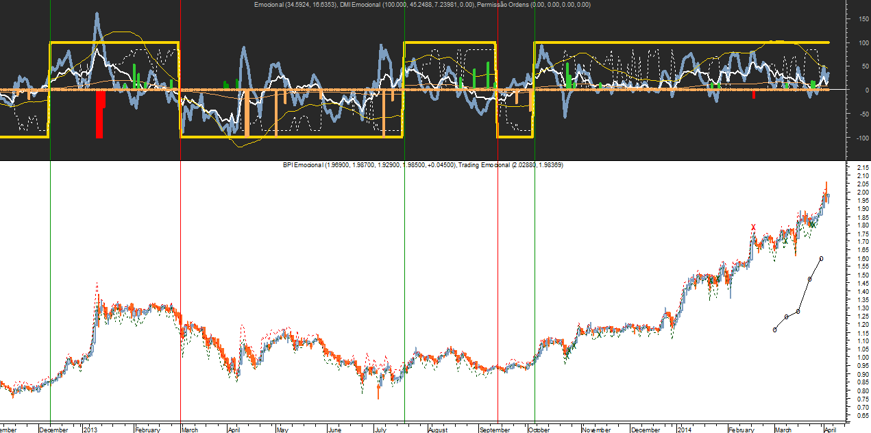 Esse é um ponto fulcral chave deste sistema do “Emocional 2014”, dispor de um indicador que procure estar pelo menos cerca de 1 dia adiantado em relação ao mercado, ou seja, que procure adivinhar, com um mínimo de 1 dia de antecedência, o movimento do mercado na barra seguinte!