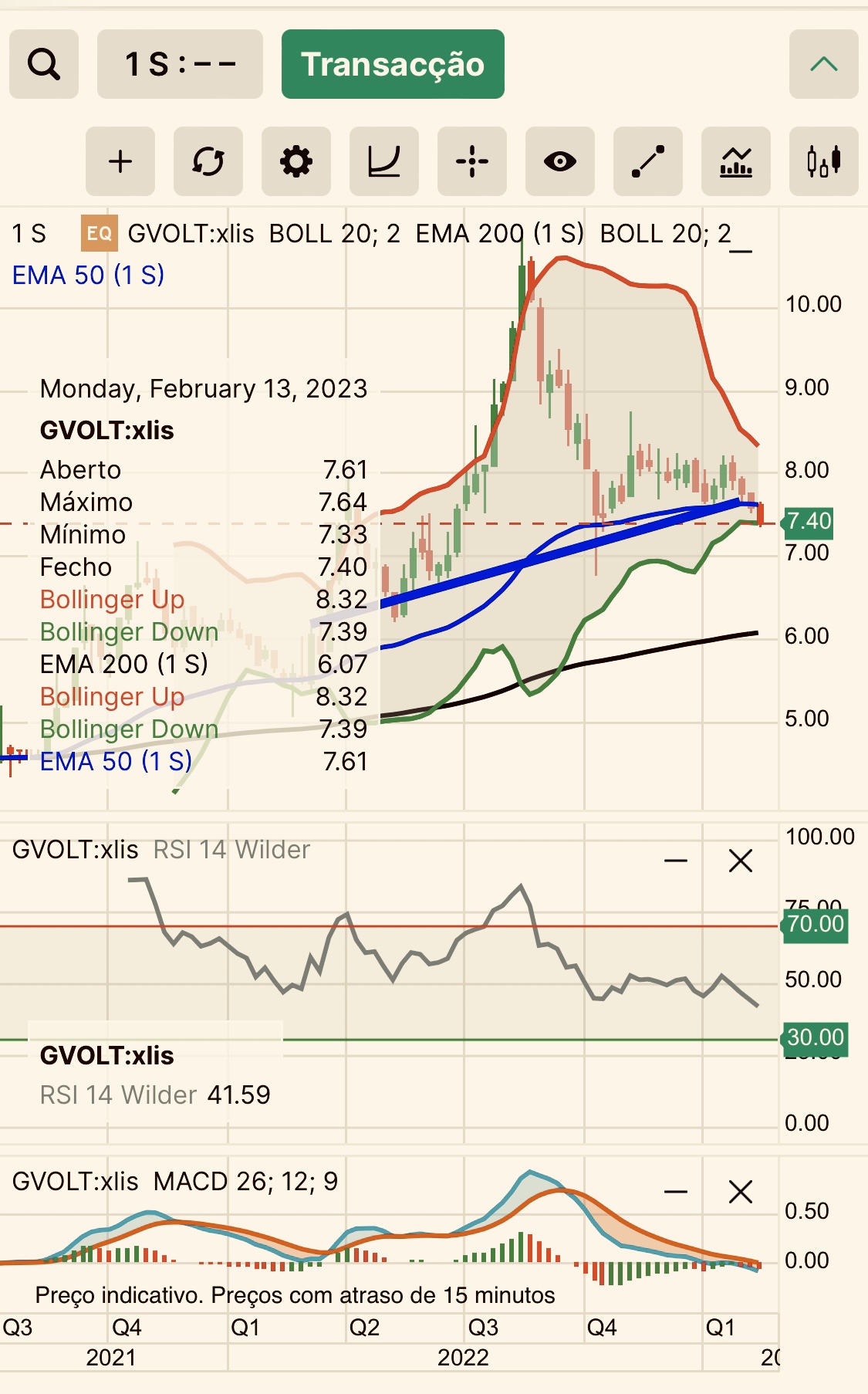 A greenvolt parece-me pronta para disparar. Posso estar enganado, ainda tem pouco historial, mas tem consolidado à volta dos 8.00 euros desde Outubro, e agora o stoch e macd do semanal estão a passar a positivos, o anúncio dos 200 milhões trouxe-a para cima da MA200 do diário e da MA20 do semanal.