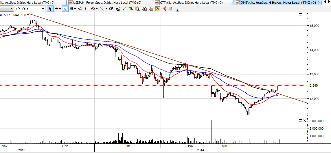 Já agora, deixo também a minha opinião (desculpem não deixar o boneco), a JMT está realmente a aguentar-se muito bem, mas pra mim só mostrará sinais consistentes de inversão acima dos 13,60/13,70 e considerarei uma inversão real acima dos 14€, até lá a JMT está em fase de "reanimação" e até aos 13,60 estará apenas a ganhar fôlego, pra já, a JMT vai respirando muito bem, vamos ver.