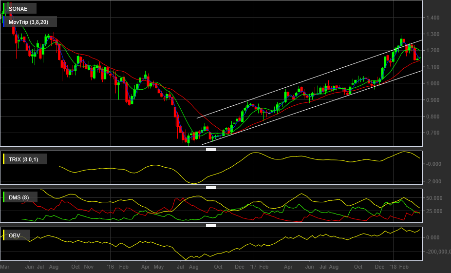 A Sonae ainda continua num processo corretivo com topos e fundos descendentes, estando neste momento a lateralizar entre 1.10€ e 1.18€,sendo suporte e resistência respetivamente em GANN.