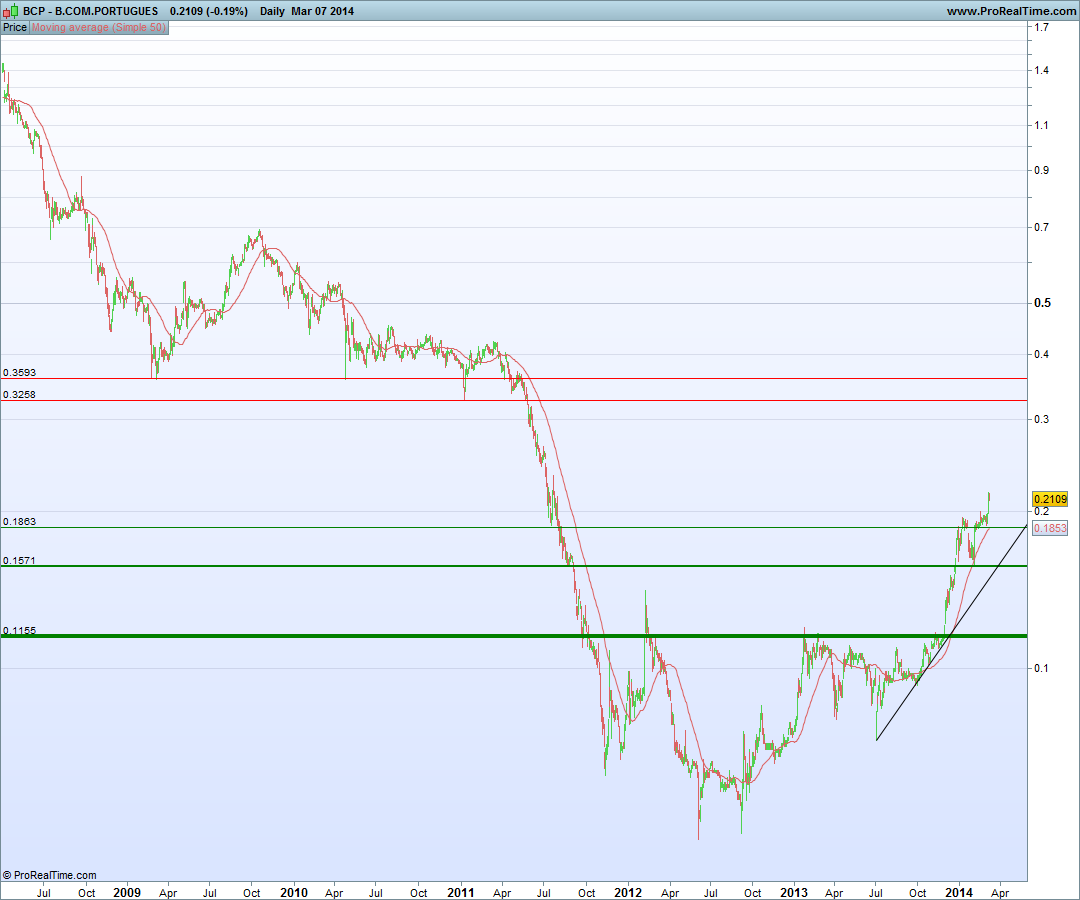 Olha o BCP "a rasgar" por aí a cima, já a subir 6,45%... Para quem está à espera das correções para entrar, não sei não, porque o título está cá com uma força!JorgeNevada Escreveu:Concordo com a tua análise, mas não com a tua LTA. Acho que uma LT não deve começar numa vela originada por uma anormalia circunstancial. Nesse caso, a vela que tu escolhes para começar a desenhar a LTA foi originada após o anúncia da demissão de Paulo Portas. A bolsa teve grandes quedas mas rapidamente foram recuperadas quando se percebeu que ainda havia estabilidade política.