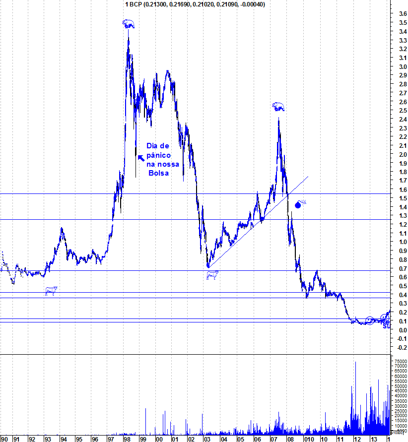 Deixo aqui o gráfico do BCP devidamente ajustado de aumentos de capital e stocks splits. O máximo histórico foi atingido em Abril de 1998 quando a cotação atingiu (a valores ajustados e, por isso, comparados com os valores de hoje) os 3,4173 euros.