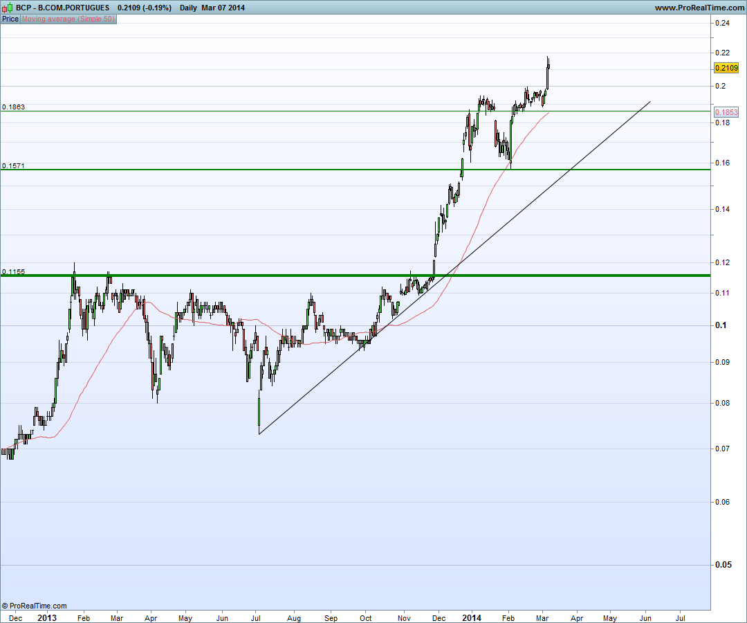 Aqui fica uma linha de tendência válida. Neste momento e isto é simplesmente a minha análise! Depois de quebrada esta mini ( talvez mais psicológica ) resistência, creio que possamos vir a assistir a mais umas subidas nos próximos dias! Toda a gente estava à espera da passagem dos 0.20 cêntimos. No meu ponto de vista, é complicado para quem está fora, porque não temos bem uma referência onde colocar o stop loss ( para quem investe com eles ). Podemos ter um suporte, na primeira linha verde (0.186 aproximadamente, mas que não me parece ser assim tão forte) caso haja uma noticia que possa "abalar" o psi 20, logo temos de retroceder até ao outro mínimo que se encontra nos 0.156 mais ou menos. Estamos a falar de cerca de 27%. Boas apostas e vamos esperar que esta semana a Rússia e Ucrânia, não nos preocupem!!
