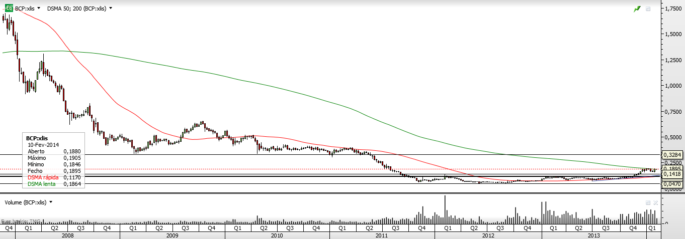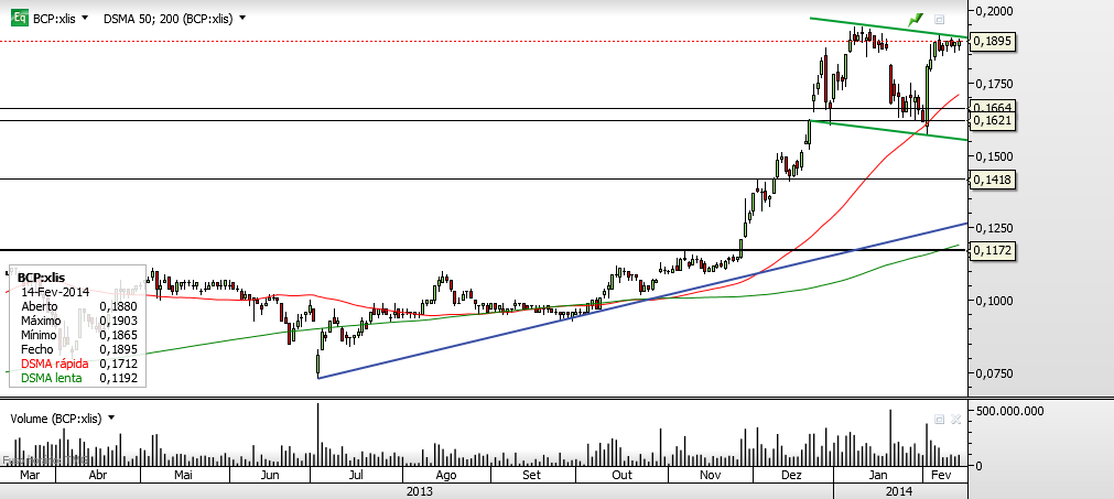 Vejo o BCP sem força para quebrar a resistência em torno da zona dos 0.19.