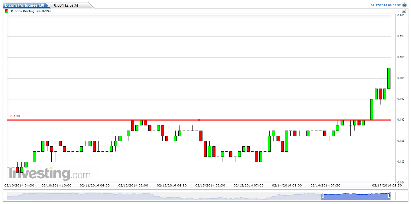 Em minha opinião a cotação encontra-se junto à zona de resistência que considerarei quebrada quando a ação fechar em novos máximos - acima de 0,1945.