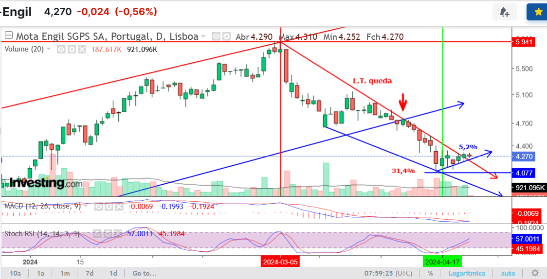 Ora, a Mota-Engil já está implantada nesses mercados fora da Europa, os quais são altamente lucrativos, e como tal, os lucros tal como na Ferrovial aumentaram igualmente mais de 100% (não estamos aqui a comparar a dimensão das empresas, pois "grande nau grande tormenta"), e em consequência disso, as acções da Mota-Engil momentaneamente desceram. Inexplicável não ? ou talvez não, e após uma necessária correção, em que os mãos fracas, na giria, sairam, deixando o caminho aberto a novas e maiores subidas; e, não será alheio a isso o facto de estar extremamente sobrevendida (noto que análise técnica não é a minha área).