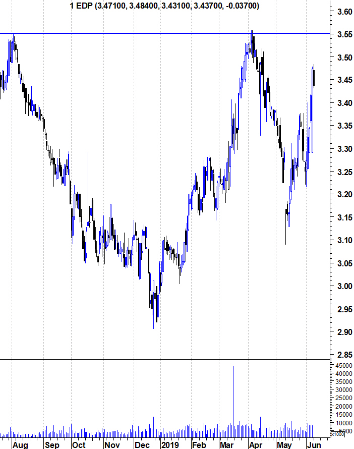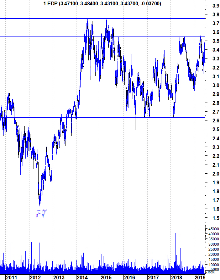 Deixo aqui os gráficos da EDP onde se vê a aproximação à resistência dos 3,55. Depois, não muito longe, há a forte resistência dos 3,75 que é o máximo da acção dos últimos 11 anos.