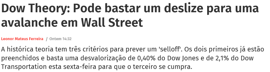 A DOW THEORY num estudo feito analisando o período temporal de 7 decadas e com retornos muito superiores ao mercado , deu neste momento sinal de forte venda, concretizando todos os pressupostos para a existência de uma forte desvalorização do mercado .