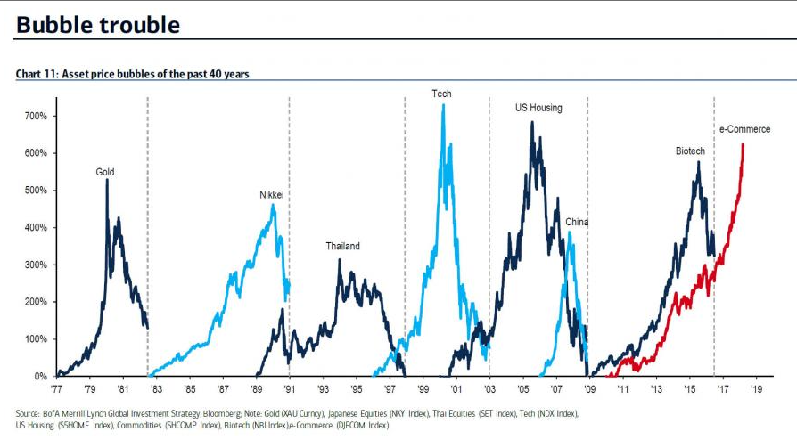 "As BofA's Michael Hartnett writes, the "lowest interest rates in 5,000 years have guaranteed a melt-up trade in risk assets", which Hartnett has called the Icarus Trade since late 2015, and points out that the latest, "e-Commerce" bubble, which consists of AMZN, NFLX, GOOG, TWTR, EBAY, FB, is up 617% since the financial crisis, making it the 3rd largest bubble of the past 40 years, and at this rate - assuming no major drop in the 6 constituent stocks - the e-Commerce bubble is set to become the largest bubble of all time over the next few months."