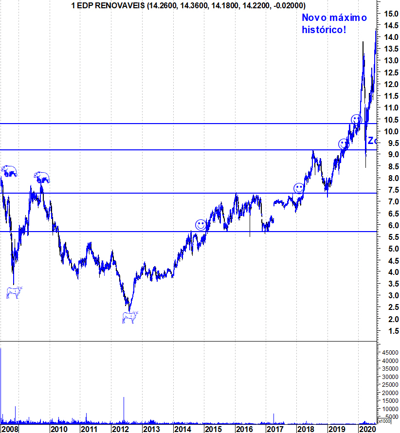 Deixo os gráficos actualizados da EDP Renováveis num dia em que a acção está calminha. O gráfico de longo prazo mostra bem o mais longo "Bull Market" da Bolsa portuguesa.