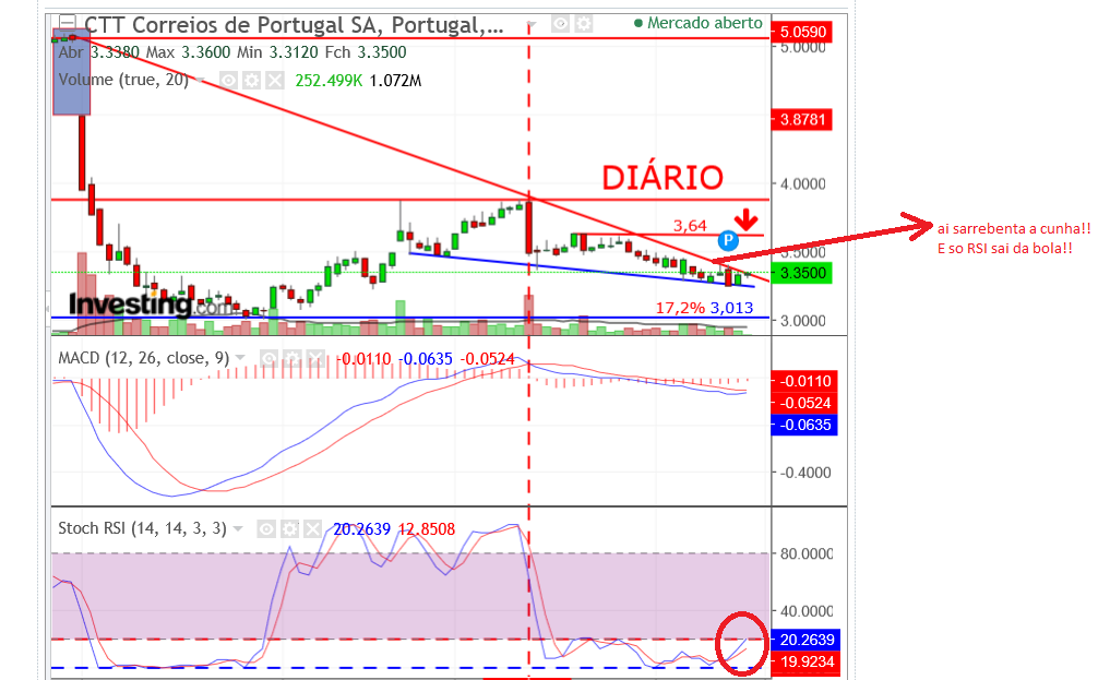 Vamos ver no que dá. Para quem ainda acredita nos CTT a melhor estratégia talvez seja a dos 50/50. É que a possibilidade de enorme amplitude existe de facto. Esse é por agora o meu plano. A acção pode aproximar-se de 4 como pode vir a 3. Uma notícia bull ou bear poderá ser o tiro de partida. A resistência está lá e amanhã não poderá abrir no verde porque isso será um sinal a favor da compra.