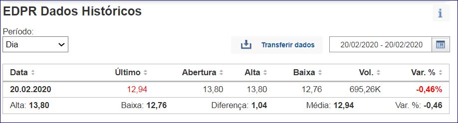 O Max Histórico da EDPR ocorreu, em 20/02/2020: 13:80