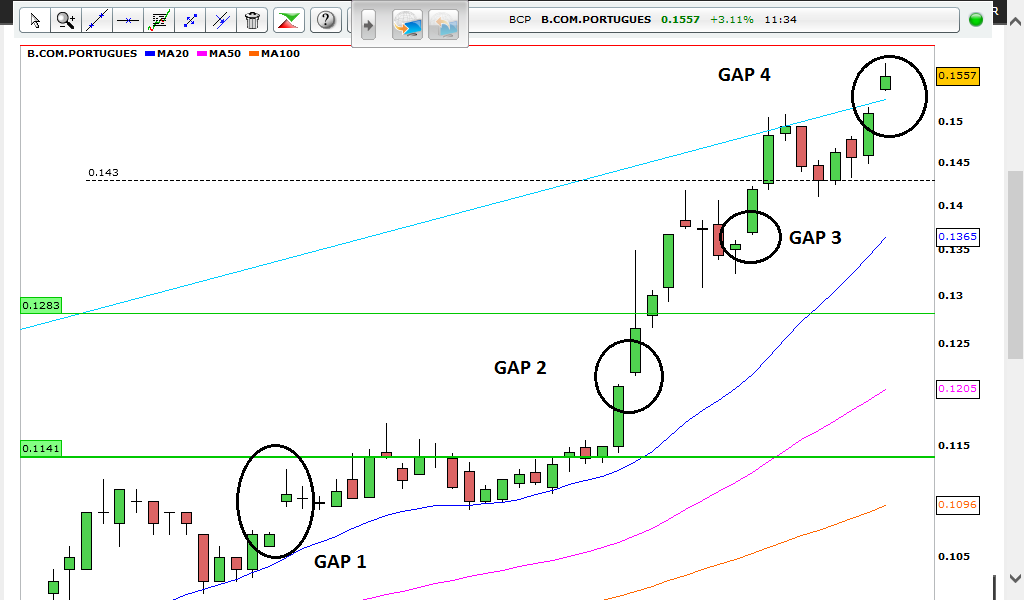 Todos os que estão no gráfico anterior, considero que são gaps, eventualmente nenhum é gap semanal, mas isso não é importante para a discussão, quanto à cotação embora tenha muito para andar, penso que poderá vir a corrigir, assim como os mercados em geral (infelizmente o nosso não chegou a arrancar ainda). Não sei é quando isso irá ocorrer, se já se quando chegar a .18, ou onde quer que seja, o caminho não vai ser sempre para norte. Cada um deverá ver qual a melhor estratégia. Parece fácil ganhar quando há subidas generalizadas, mas isso não é bem assim, e os traders todos eles sabem isso muito bem. No entanto saber deixar correr os ganhos é uma regra fundamental da bolsa, para quem quer ganhar na bolsa, mas nem sempre estamos à altura dessa regra....