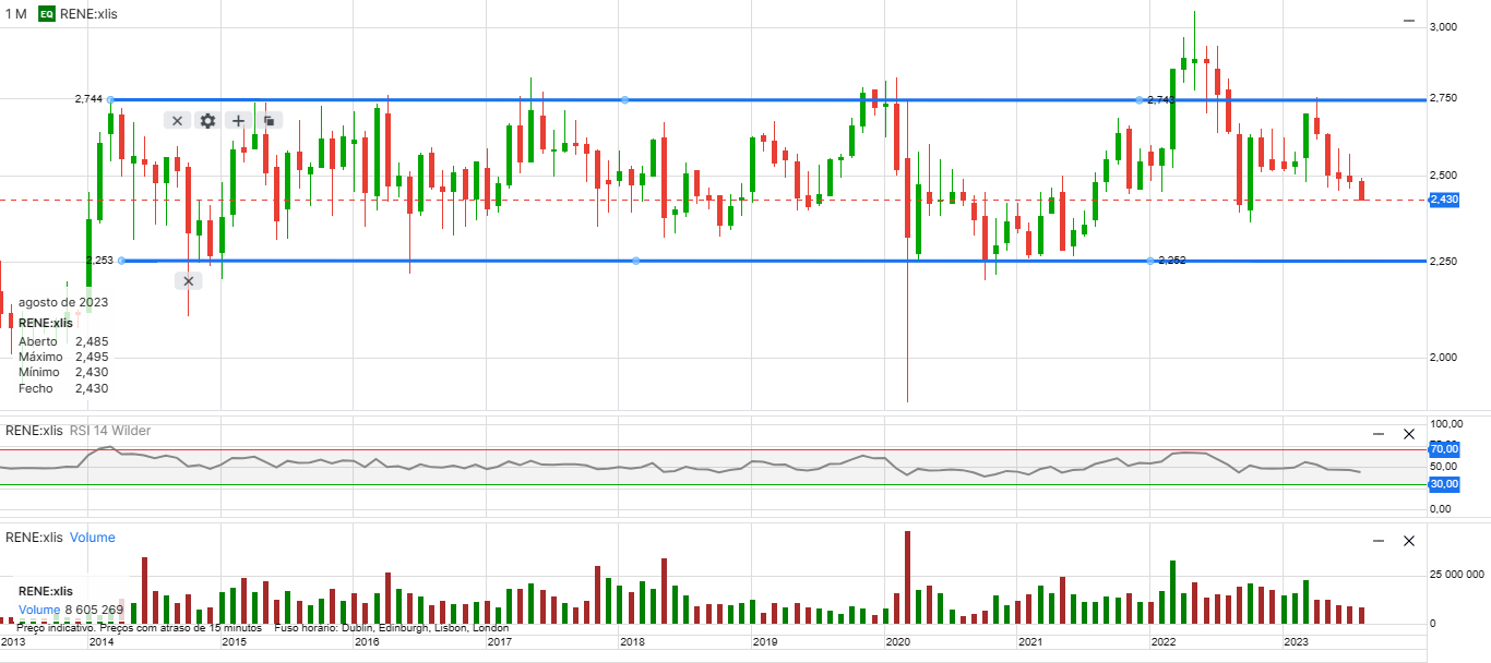 A REN como muitos tem referido, é um "depósito a prazo" com poucos riscos, e para investidores que não gostam de muito stress. Nem todos gostam de "roleta russa". É evidente que as taxas pagas atualmente pela banca em DP aumentaram, mas continuam ainda baixas. Se olharmos para o horizonte temporal de 10 anos, verificarmos que a REN oscila entre os 2,25 e os 2,75 euros. Está atualmente nos 2,43, ou seja, a 0,18 do grande suporte dos 2,25, ou seja, a +/- 7,5% dos mínimos.