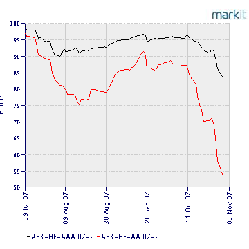 Ora, os gráficos que tenho colocado aqui (seguem abaixo os de hoje), mostram que as tranches AA e A estão neste momento a sofrer as maiores perdas (as BBB já estão completamente debaixo de água), sendo uma questão de tempo até que as tranches AAA sejam atingidas.