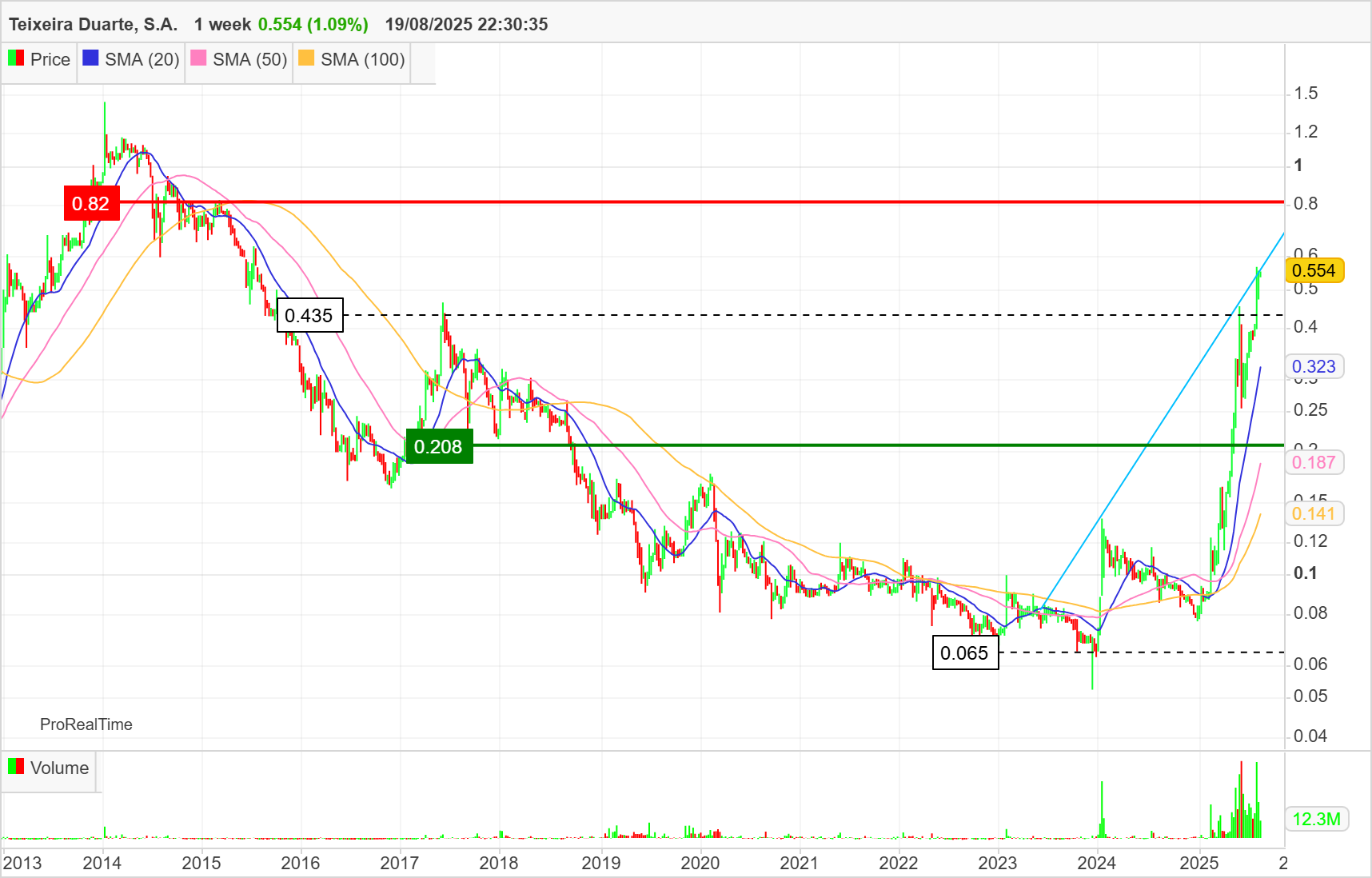 Na semana em que vai apresentar resultados ( dia 22 de Agosto ) a Teixeira Duarte está bem posicionada para novos máximos relativos de anos.