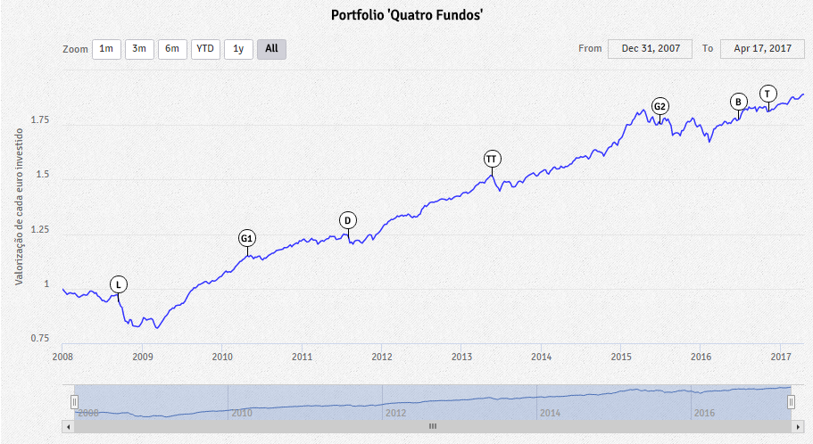 O meu alvo é tentar ajudar quem investe em euros, potencialmente em Portugal e que pretende usar fundos sem comissões de subscrição/resgate. Estou bastante contente com a performance out-of-sample. A carteira foi apresentada a 11-11-2016 aqui no fórum. Entretanto: