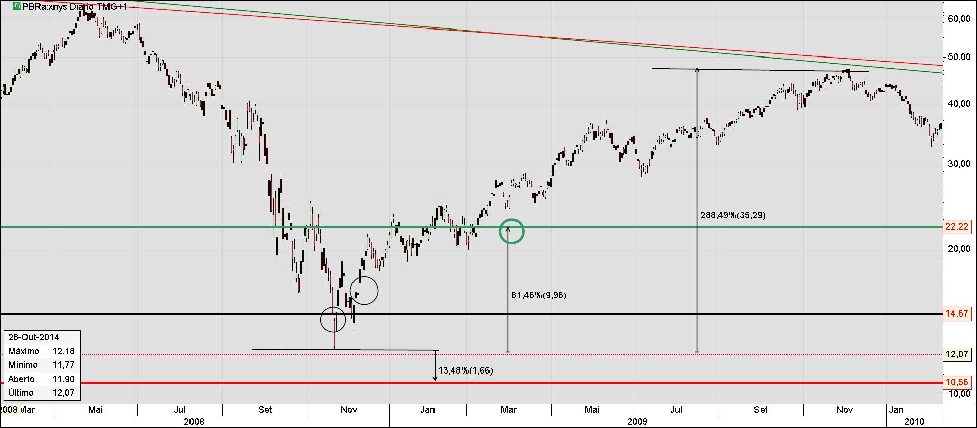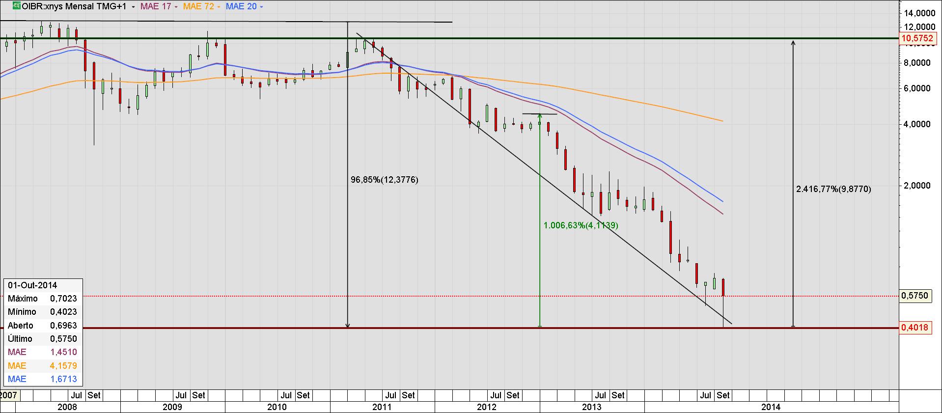 a partida encontrou um fundo e se neste próximo mês de novembro seguir a fazer fechos superiores aos anteriores é a prematura inversão de tendência e se verificando a inversão de tendência teremos então a onda 2, que possui o belo numero de 2.416,77 %, indo buscar os preços de maio/julho de 2011. A teoria diz que as ondas possuem tamanhos idênticos. Se buscarmos uma onda 2 até os preços de janeiro de 2013, é o belo numero de 1.006,63%. É isso. Viva a onda 2, além daquele martelinho de sinal da inversão de tendência ou é caixão e vela preta.