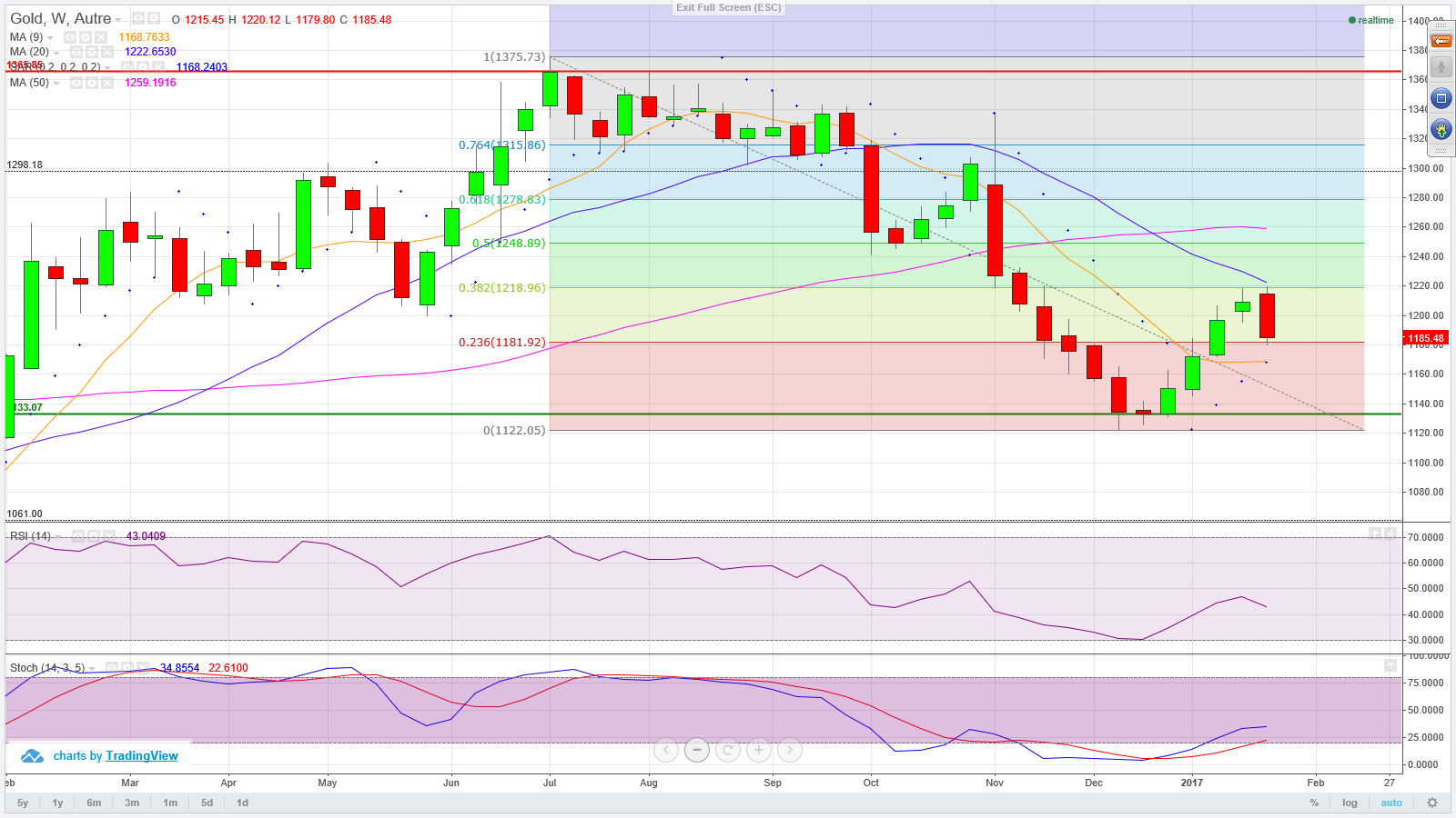 O preço do ouro parou sua alta em $ 1.220 como nós esperávamos de $ 1.120. Um recuo é justificado. Eu prefiro ver o movimento do preço para $ 1.160 e a retração de Fibonacci de 61.8% de todo o aumento e, então, reverter para cima para $ 1.300.