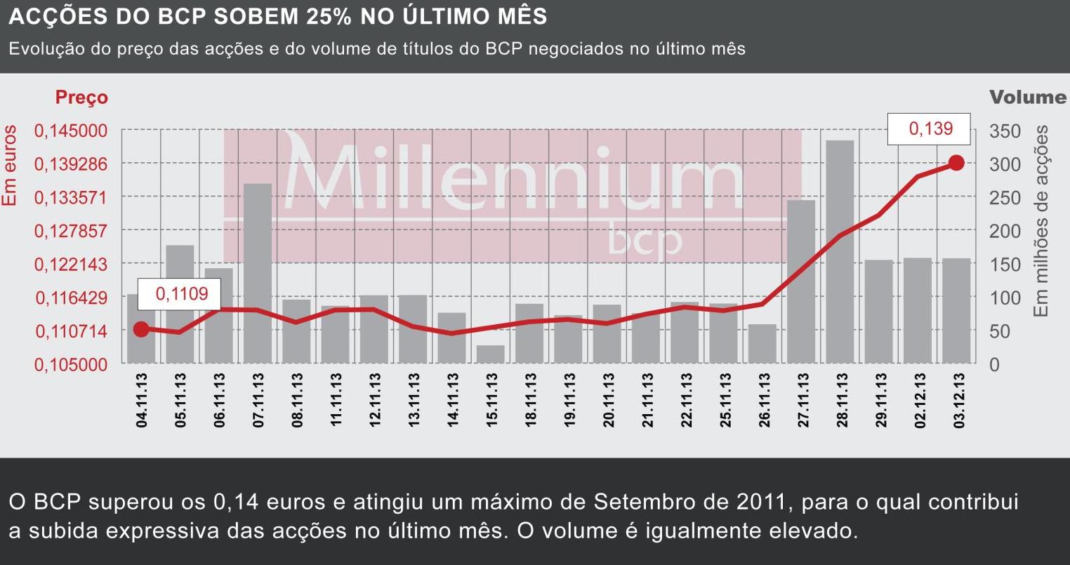Esta é a sexta sessão consecutiva de ganhos para o BCP, num período em que as acções acumulam uma subida de 22,6%. Só no último mês (desde o dia 4 de Novembro) as acções do BCP sobem 25%.