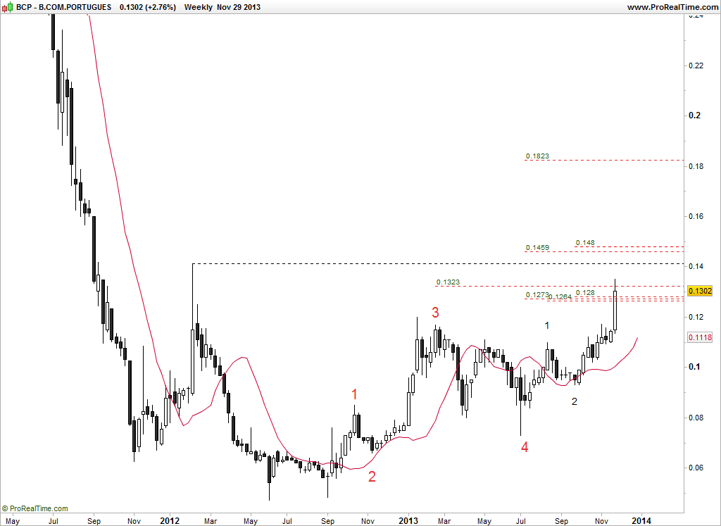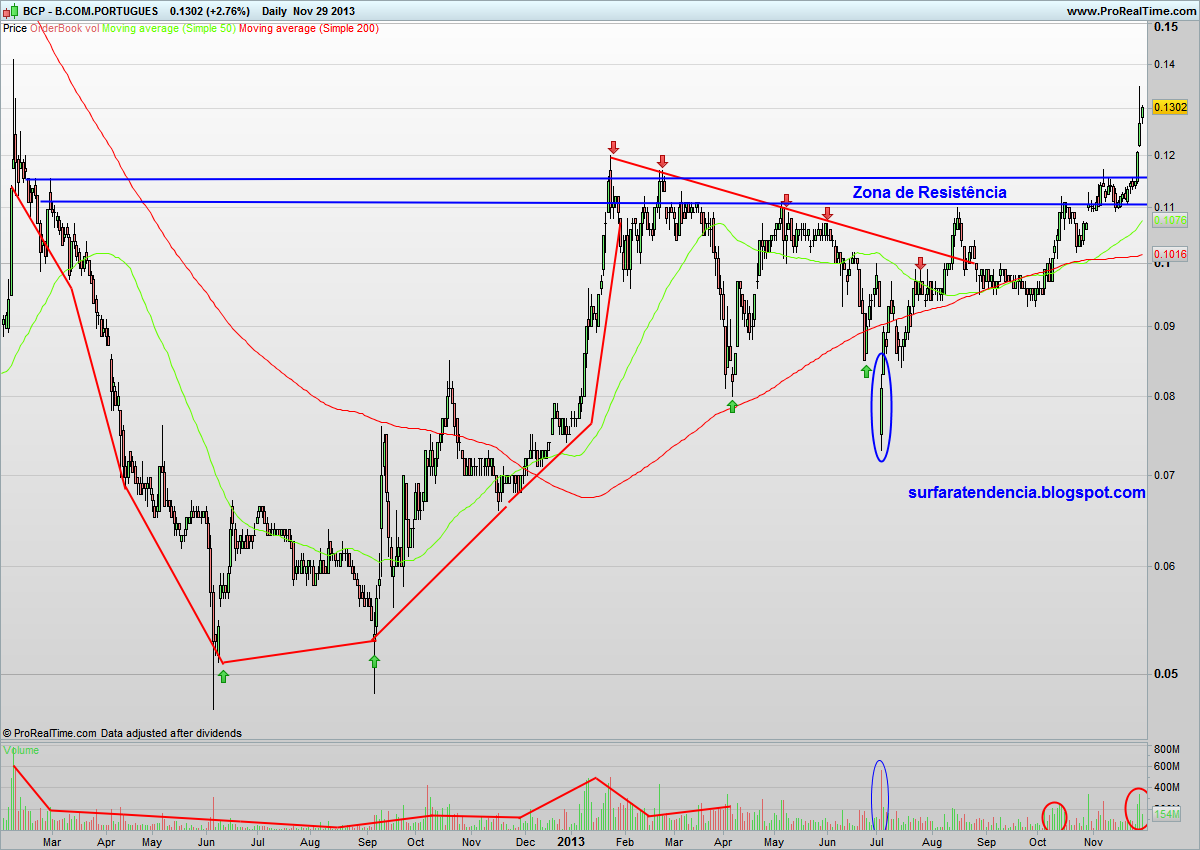 O BCP tem sido uma das estrelas do PSI-20 nos últimos três dias, acumulando já um ganho de 14% desde então. Este arranque foi motivado pela quebra da zona de resistência, que perdurava há praticamente dois anos! Como tive oportunidade de referir na última análise que lhe foi feita, em Agosto deste ano, uma quebra desta resistência far-me-ia ficar positivista numa perspectiva de longo prazo.