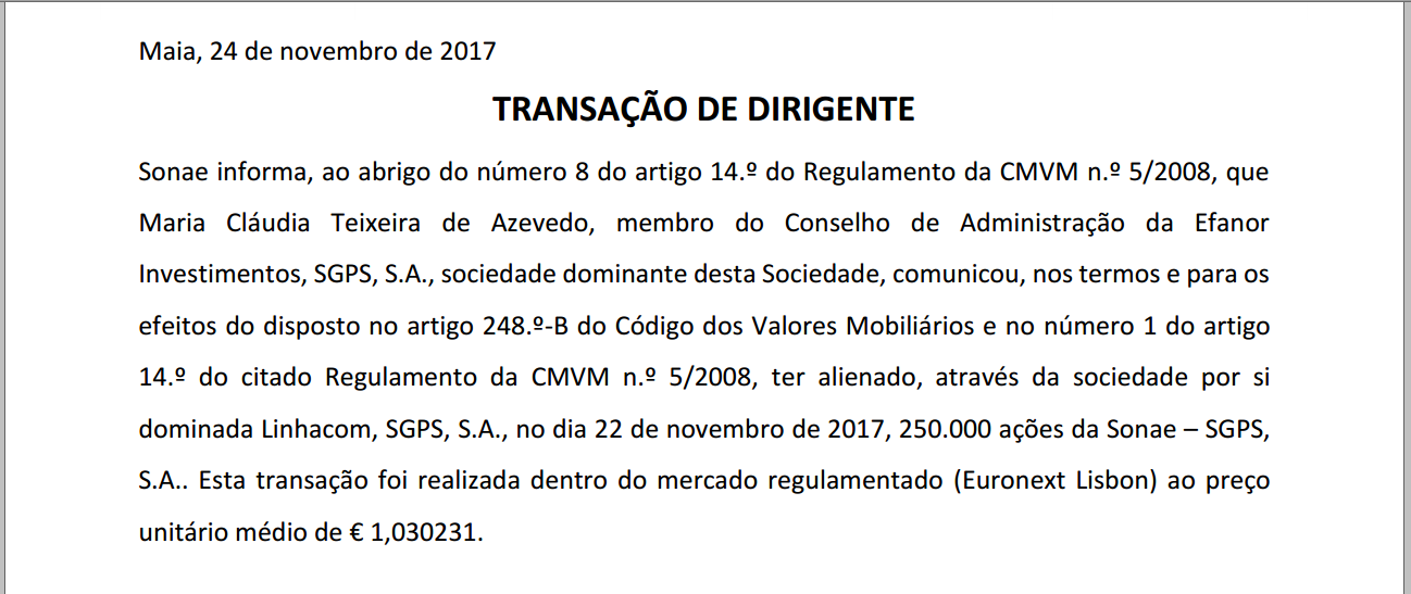 Mais uma situação de um dirigente a vender títulos da empresa, situação anterior tinha sido a PROMENDO na altri.