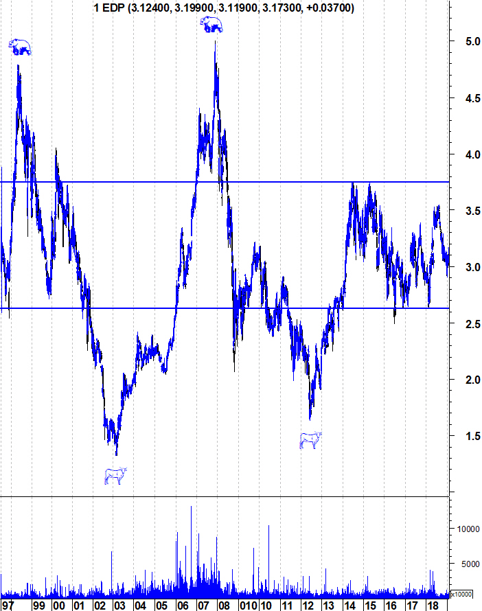 Porque é que há meses que nada escrevo sobre a EDP? Porque não consigo analisar o gráfico. Nem todos os gráficos me dão indicações claras e o gráfico da EDP, nos últimos meses, é para mim um total mistério sem qualquer referência interessante.