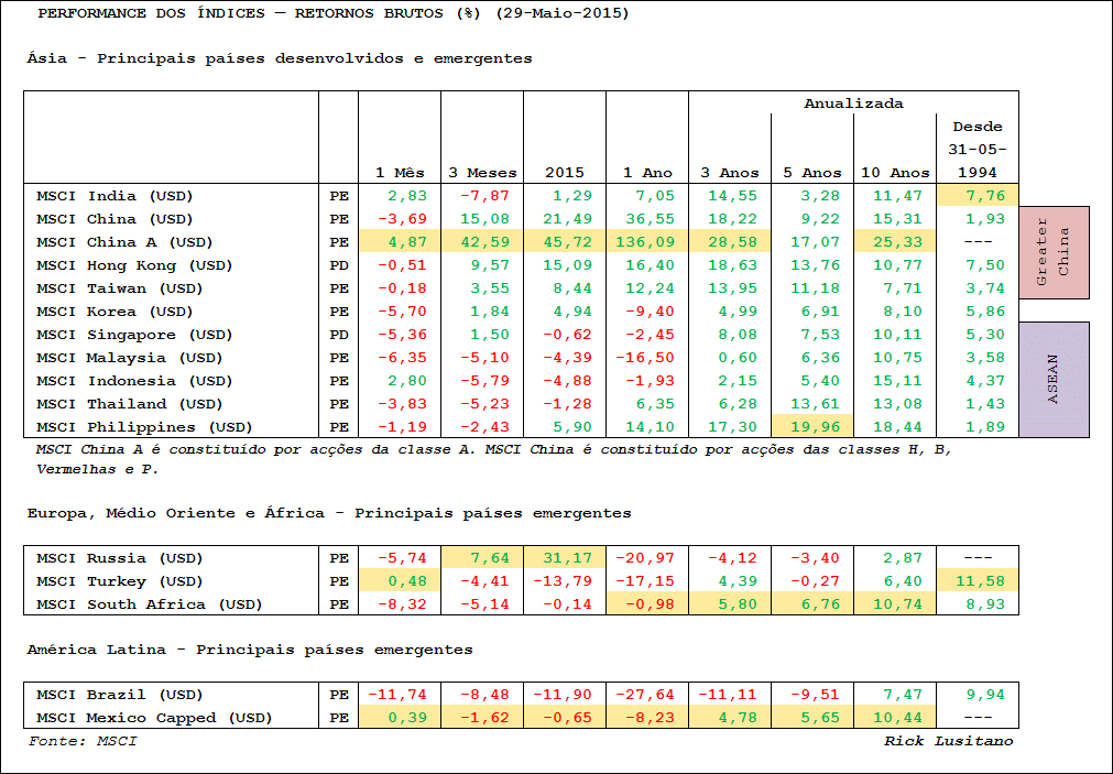 O3 Escreveu:Se quiseres ter o trabalho de compilar os retornos anuais, nos últimos 10-15 anos, dos EUA e da Zona Euro/Europa com países emergentes ou afins como a Tailândia, Indonésia, Turquia, Rússia, Brasil ou a China (este para se verem os anos de 2014 e 2015), vais ver que, em certos anos, é num destes países que se obtêm os retornos máximos anuais, para além de que, em determinados anos, alguns destes países funcionaram como contraciclo aos retornos dos EUA ou Zona Euro/Europa.