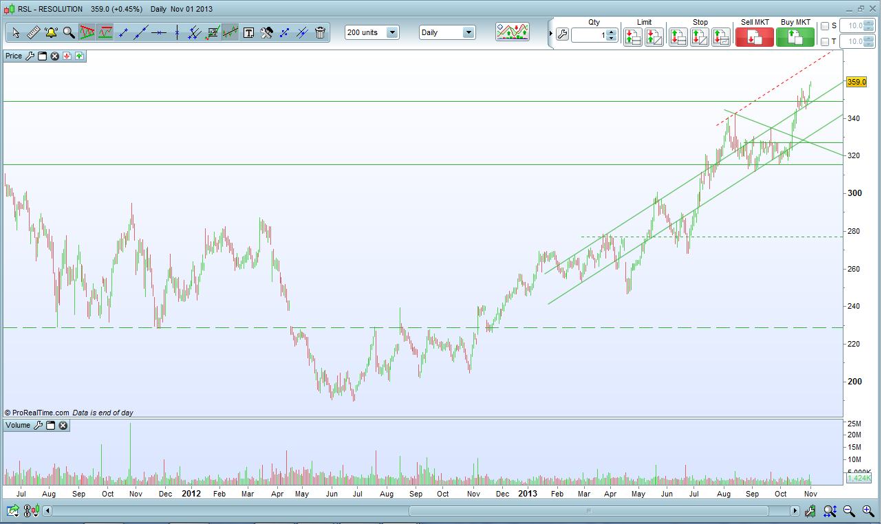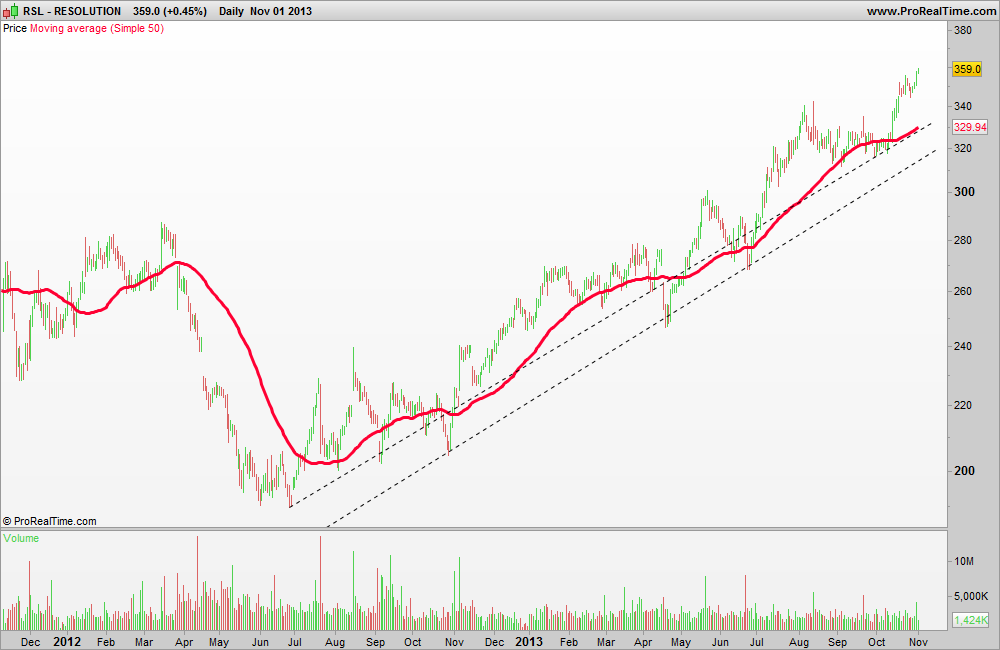 Tem uma tendência bem definida, em pouco mais de um ano quase subiu 100%, muito bom. Existem vários participantes aqui que fazem trend following, que sonham encontrar acções assim todos os dias.