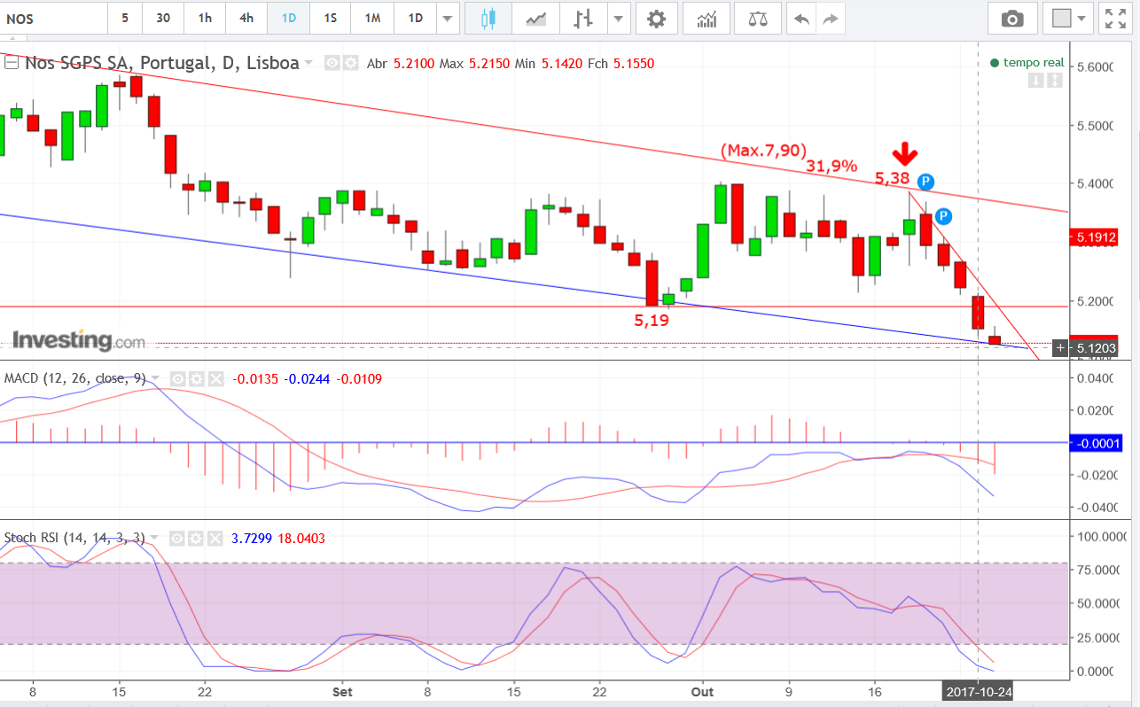 Da NOS, diremos que o mercado tem sinalizado desconforto! E nunca devemos esquecer que o mercado contém sempre quem saiba muito mais do que nós acerca da real situação da empresa, pelo que o melhor que temos a fazer é ver o gráfico. E o que vemos é uma projeção ativada de duplo topo para mínimos do ano, pelos 4,70€, na antecâmara da apresentação de resultados do terceiro trimestre, a 8 de Novembro!"
