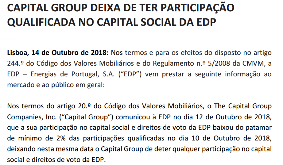 “O The Capital Group Companies, Inc. (“Capital Group”) comunicou à EDP no dia 12 de Outubro de 2018, que a sua participação no capital social e direitos de voto da EDP baixou do patamar de mínimo de 2% das participações qualificadas no dia 10 de Outubro de 2018, deixando nesta mesma data o Capital Group de deter qualquer participação no capital social e direitos de voto da EDP“, pode ler-se no comunicado enviado ao mercado"