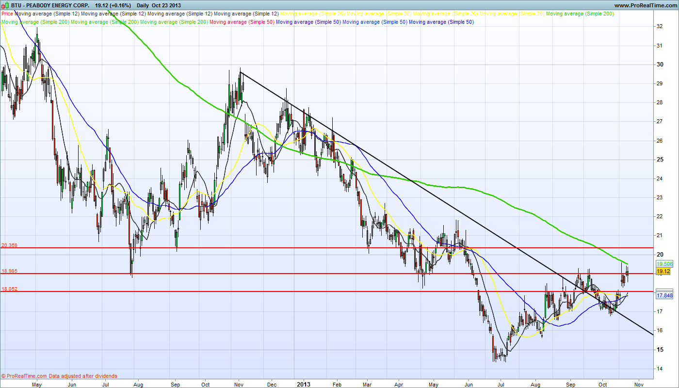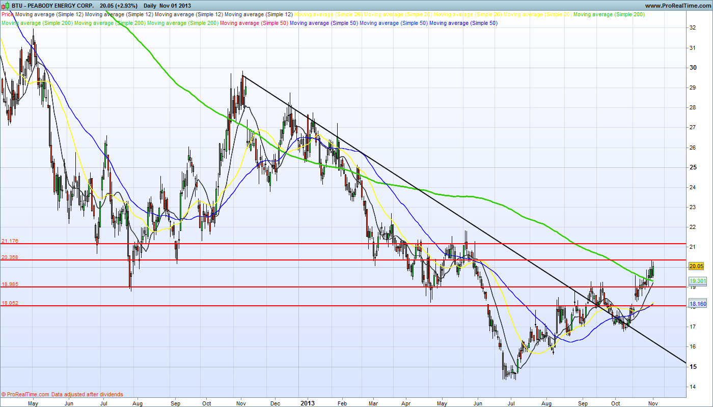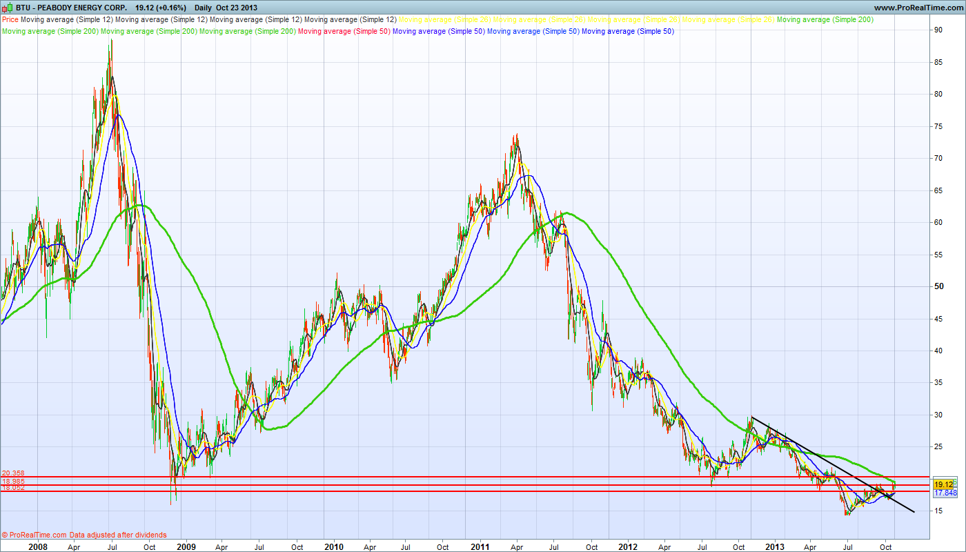 - A Peabody Energy Corp. (BTU) é sem dúvidas uma empresa com passado. Não é uma empresa qualquer, tem 8200 funcionários, aliás, pelo teu gráfico facilmente se observa que não faz muito tempo que esteve a cotar a preços bem superiores.
